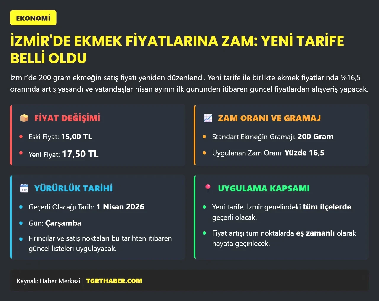 Yeni fiyat tarifesinin yürürlüğe gireceği tarih, 1 Nisan 2026 Çarşamba günü olarak kesinleşti. Bu tarihten sonra fırıncılar ve satış noktalarının güncel fiyat listelerini uygulamaları bekleniyor. 200 gramlık standart ekmekteki bu fiyat artışı, İzmir’in tüm ilçelerinde aynı anda hayata geçirilecek.