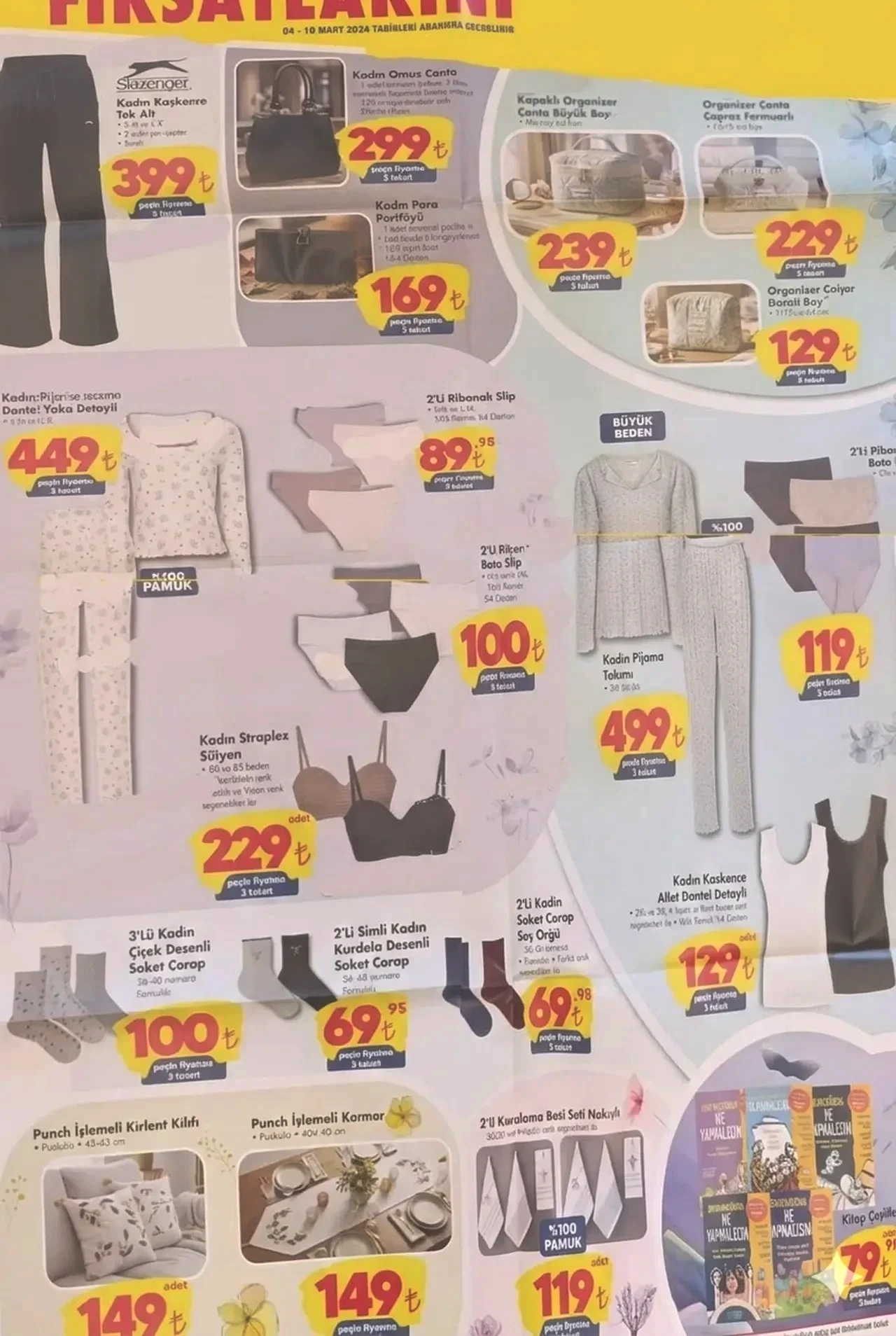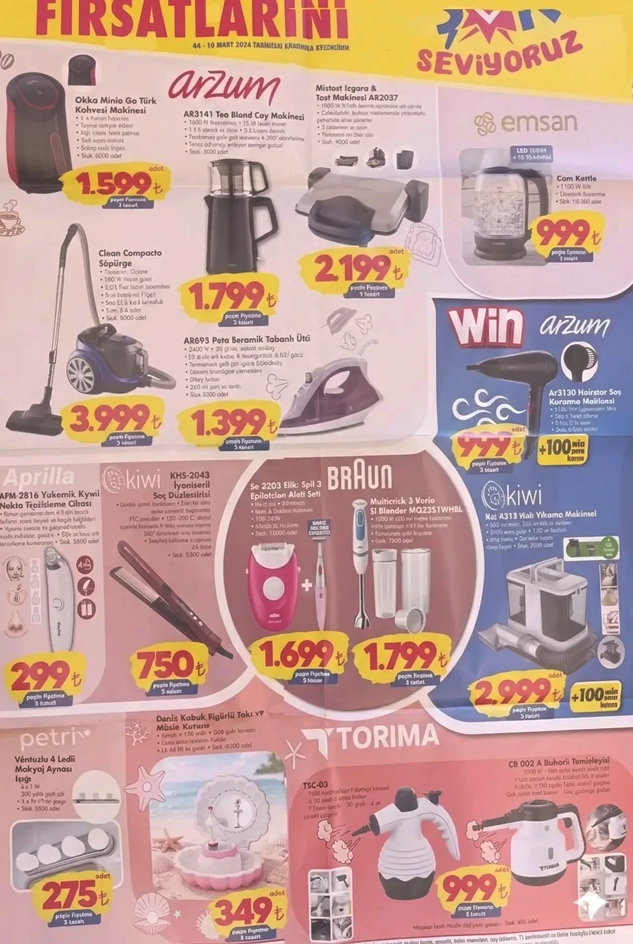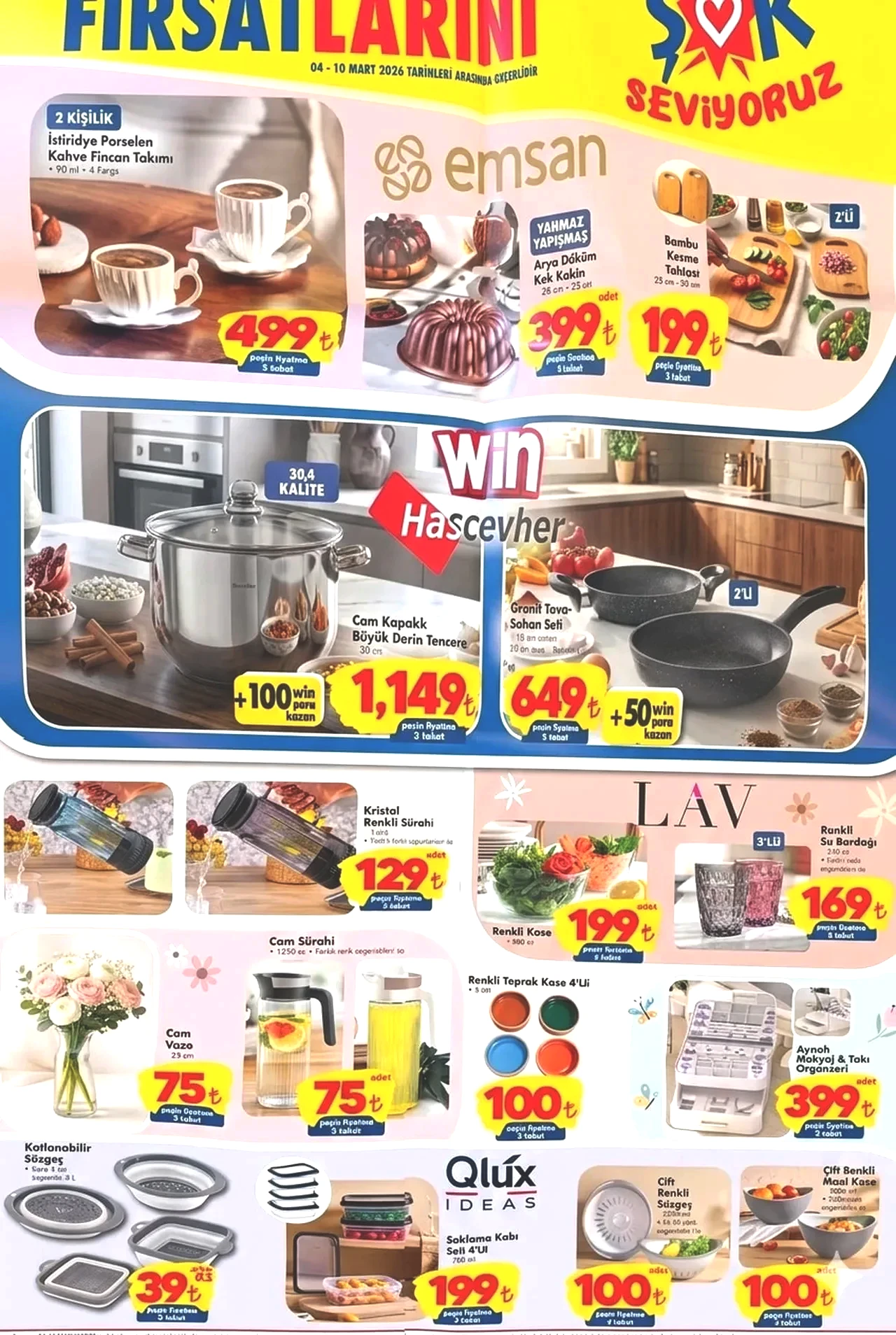 ŞOK marketlerinde haftanın indirimli ürünlerinin listesi açıklandı. Tava-Sahan Seti raflarda 649 TL’den satışa sunulacakken, Seramik Tabanlı Ütü ise 1.399 TL olarak yer alacak. Tost Makinesi, 2.199 TL fiyatıyla müşterilerin beğenisine sunulacak. Ayrıca, Kristal Renkli Sürahi 129 TL, Cam Vazo 75 TL, Kare 2’li Borcam 499 TL, 6’lı Su Bardağı 249 TL ve 8 Parça Çay Takımı 249 TL’den tüketicilere ulaşacak. 20 Mart’ta kutlanacak Ramazan Bayramı’ya özel olarak, çeşitli şeker ve çikolata ürünleri 65 TL ile 375 TL arasında satışta olacak. Ek olarak, Saç Kurutma Makinesi 999 TL, Elektrikli Süpürge 3.999 TL’den reyonlarda yer alacak. Bunun dışında, organizer çanta çeşitleri, kadın çantaları, eşofmanlar ve ev giyim ürünleri de mağazalarda müşterileri bekliyor. Katlanabilir süzgeç, saklama kapları, ayaklı sunumluk ve farklı kavanoz modelleri de raflarda yer alacak. İşte, ŞOK 4 Mart Çarşamba günü geçerli aktüel ürünler kataloğu…